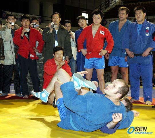 21일 오후 서울 올림픽공원 역도경기장에서 열린 '2006 삼보 페스티벌'에 초청된 세계 종합격투기의 최강자 표도르 에밀리아넨코가 블라디미르 보르노프 트레이너와 함께 삼보 시범을 보이는 모습을 참석자들이 카메라에 담고 있다./올림픽공원=박영태 기자 ds3fan@osen.co.kr [Copyright ⓒ 한국 최고의 스포츠 전문 미디어 OSEN(www.osen.co.kr) 무단전재 및 재배포 금지]