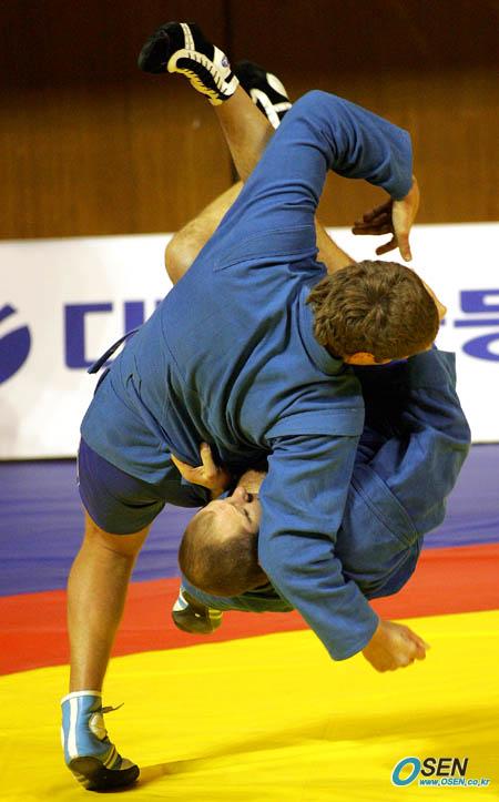 21일 서울 올림픽공원 역도경기장에서 열린 '2006 삼보 페스티벌'에 특별 초청된 세계 종합격투기의 최강자 표도르 에밀리아넨코와 동생 알렉산더가 시범경기를 벌였다. 알렉산더(왼쪽)가 표도르를 들어 넘기고 있다./올림픽공원=주지영 기자 jj0jj0@osen.co.kr [Copyright ⓒ 한국 최고의 스포츠 전문 미디어 OSEN(www.osen.co.kr) 무단전재 및 재배포 금지]