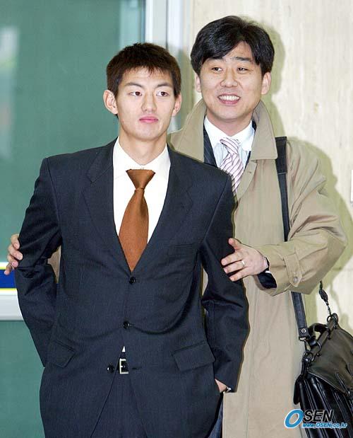 북한대표 출신의 조총련계 축구선수인 안영학(전 나고야 그램퍼스 에이트)이 부산 아이파크에 입단하기 위해 22일 오후 김포공항으로 입국했다. 구단 관계자가 안영학에게 포즈를 취하고 가자며 자리를 잡아주고 있다./김포공항=손용호 기자 spjj@osen.co.kr [Copyright ⓒ 한국 최고의 스포츠 전문 미디어 OSEN(www.osen.co.kr) 무단전재 및 재배포 금지]