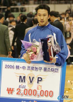 "코트를 찾은 관중들을 즐겁게 해주기 위해 열심히 뛰었습니다". 지난해에 이어 2회째를 맞은 한중 올스타전 1차전에서 2년 연속 최우수선수(MVP)에 선정된 김승현의 수상 소감이다. 김승현은 22일 서울 잠실실내체육관에서 열린 2006 한중 올스타전 1차전에서 6득점밖에 올리지 못했지만 무려 18개의 어시스트를 쓸어담는 수훈으로 기자단 유효투표 58표 중 31표를 얻으며 1차전 MVP에 선정됐다. 1, 2쿼터 전반에만 19득점을 넣으며 이날 26득점과 13리바운드로 '더블더블'을 기록한 나이젤 딕슨도 유력한 MVP 후보였으나 막판 김승현의 분전은 너무나 빛났다. 80-70으로 10점차로 앞서 승부의 앞을 바라볼 수 없었던 4쿼터 1분40초부터 1분16초동안 김주성이 4개의 2점슛을 몰아넣는 동안 2개의 눈부신 어시스트는 그야말로 이날 체육관에 모인 관중들을 환호케 했다. 한편 중국의 가드 류웨이와 또다시 자존심 대결을 펼친 김승현은 "지난해 올스타전때의 류웨이와 큰 차이가 없었다"며 "열심히 해서 이기겠다는 마음이 중국 선수들보다 우리가 더 강했던 것 같다"고 말했다. 이날 류웨이는 김승현과 같은 6득점을 올렸지만 4개의 어시스트를 올리는데 그쳤다. 이어 김승현은 한국과 중국의 가드의 차이가 무엇이냐는 중국 기자의 질문에 "중국 선수에 비해 키가 작긴 하지만 더 빠른 플레이를 한다고 생각한다"고 답했다. 잠실체=글,박상현 기자 tankpark@osen.co.kr 사진, 박영태 기자 ds3fan@osen.co.kr [Copyright ⓒ 한국 최고의 스포츠 전문 미디어 OSEN(www.osen.co.kr) 무단전재 및 재배포 금지]