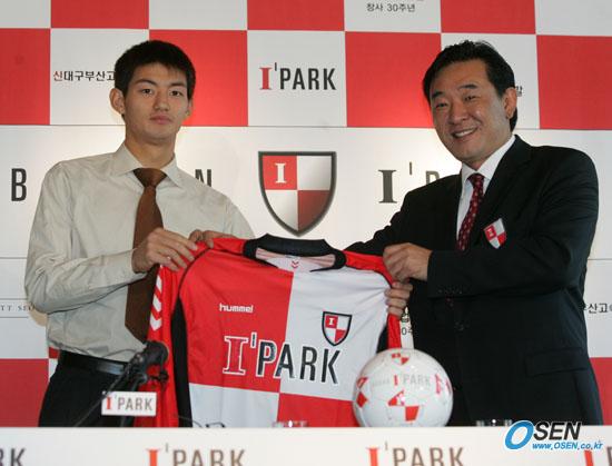 북한대표 출신 안영학이 22일 오전 서울 대치동 파크 하얏트호텔에서 부산 아이파크 입단식을 가졌다. 안영학이 입단 계약서에 사인한 뒤 이준하 부산 아이파크 사장과 함께 유니폼을 들어보이고 있다./박영태 기자 ds3fan@osen.co.kr [Copyright ⓒ 한국 최고의 스포츠 전문 미디어 OSEN(www.osen.co.kr) 무단전재 및 재배포 금지]