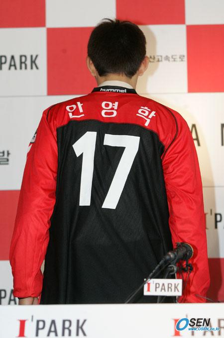 북한대표 출신 안영학이 22일 오전 서울 대치동 파크 하얏트호텔에서 부산 아이파크 입단식을 가졌다. 안영학이 입단 계약서에 사인한 뒤 부산 유니폼을 입고 돌아서서 배번 17번을 보여주고 있다./박영태 기자 ds3fan@osen.co.kr [Copyright ⓒ 한국 최고의 스포츠 전문 미디어 OSEN(www.osen.co.kr) 무단전재 및 재배포 금지]