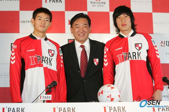일본 나고야 그램퍼스 에이트에서 활약하던 북한대표 출신 미드필더 안영학이 22일 오전 서울 대치동 파크 하얏트 호텔에서 청소년대표를 역임한 도쿄 베르디 출신 수비수 이강진과 함께 부산 아이파크 입단식을 가졌다. 안영학(왼쪽)과 이강진이 이준하 부산 아이파크 사장과 나란히 기념 촬영하고 있다./박영태 기자 ds3fan@osen.co.kr [Copyright ⓒ 한국 최고의 스포츠 전문 미디어 OSEN(www.osen.co.kr) 무단전재 및 재배포 금지]