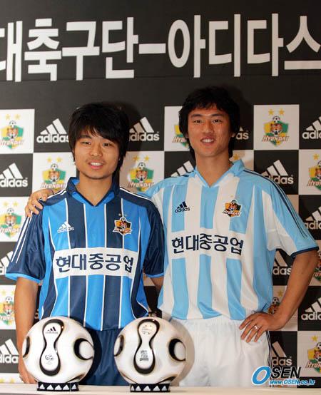 울산 현대가 23일 오전 서울 밀레니엄 힐튼 호텔에서 아디다스와 2년간 스폰서십 조인식을 가졌다. 아디다스 로고가 새겨진 홈 유니폼을 입은 최성국과 원정 유니폼 차림의 이종민이 포즈를 취하고 있다./주지영 기자 jj0jj0@soen.co.kr [Copyright ⓒ 한국 최고의 스포츠 전문 미디어 OSEN(www.osen.co.kr) 무단전재 및 재배포 금지]