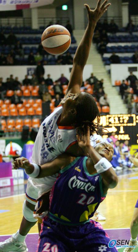 24일 서울 장충체육관서 벌어진 2006 금호아시아나배 여자 프로농구 겨울리그 춘천 우리은행과 광주 신세계의 경기서 우리은행의 특급 용병 캐칭이 신세계 비어드보다 먼저 점프, 리바운드를 걷어내고 있다. /장충체=주지영 기자 jj0jj0@osen.co.kr [Copyright ⓒ 한국 최고의 스포츠 전문 미디어 OSEN(www.osen.co.kr) 무단전재 및 재배포 금지]