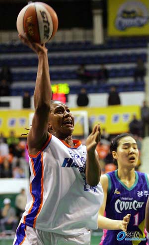 춘천 우리은행의 무서운 상승세 앞에 광주 신세계는 전혀 맥을 추지 못했다. 우리은행은 24일 서울 장충체육관에서 열린 2006 금호아시아나배 여자프로농구 겨울리그 정규리그 중립경기에서 만장일치로 2라운드 최우수선수에 뽑힌 '우승 청부사' 타미카 캐칭(24득점, 3점슛 2개, 14리바운드, 5어시스트)과 12득점씩 올려준 홍현희, 김은경의 활약으로 신세계에 90-66 대승을 거뒀다. 이로써 7연승의 상승가도를 달린 우리은행은 8승 4패가 되며 9승 3패로 선두를 달리고 있는 안산 신한은행을 1경기차로 뒤쫓았다. 반면 패한 신세계는 4승 8패가 되며 앞선 경기에서 천안 국민은행을 제압한 용인 삼성생명과 함께 공동 최하위(5위)가 됐다. 신세계로서도 분전했지만 승부는 3쿼터 중반부터 갈렸다. 1, 2쿼터 전반까지 40-33, 7점차로 마친 우리은행은 54-46이던 3쿼터 종료 4분 15초부터 신세계의 득점을 완전히 봉쇄하면서 무려 11득점을 폭발시켰다. 캐칭의 자유투 2개 성공으로 56-46, 10점 앞선 우리은행은 김진영(3득점)의 3점슛과 김은경, 홍현희의 2점슛이 터지더니 종료 1분 2초전에 다시 김은경의 2점슛이 나온 것. 3쿼터까지 65-49, 16점차로 앞서며 승기를 잡은 우리은행은 경기종료 53초를 남겨놓고 28점까지 점수차이를 더욱 벌리며 신세계를 줄곧 압도, 편안하게 승리를 챙겼다. ■ 24일 전적 ▲ 장충 춘천 우리은행 90 (23-11 17-22 25-13 25-20) 66 광주 신세계 ■ 중간 순위 (24일 현재) ① 안산 신한은행 9승 3패 (0.750) - ② 춘천 우리은행 8승 4패 (0.667) 1.0 ③ 천안 국민은행 6승 6패 (0.500) 3.0 ④ 구리 금호생명 5승 7패 (0.417) 4.0 ⑤ 광주 신세계 4승 8패 (0.333) 5.0 ⑥ 용인 삼성생명 4승 8패 (0.333) 5.0 장충체=글, 박상현 기자 tankpark@osen.co.kr 사진, 주지영 기자 jj0jj0@osen.co.kr [Copyright ⓒ 한국 최고의 스포츠 전문 미디어 OSEN(www.osen.co.kr) 무단전재 및 재배포 금지]