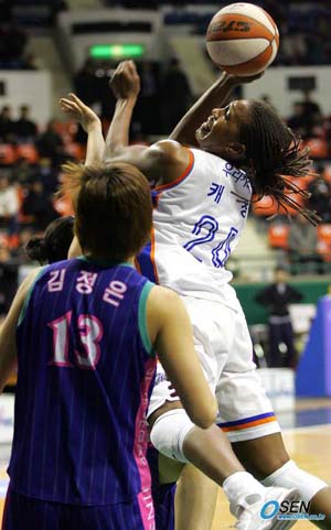 춘천 우리은행이 파죽의 7연승을 달리며 선두 안산 신한은행과의 승차를 1경기로 줄인 반면 용인 삼성생명은 3연패 수렁에서 탈출하며 '단독 꼴찌'에서 '공동 최하위'가 됐다. 우리은행은 24일 서울 장충체육관에서 열린 2006 금호아시아나배 여자프로농구 겨울리그 정규리그 중립경기에서 만장일치로 2라운드 최우수선수에 뽑힌 '우승 청부사' 타미카 캐칭(24득점, 3점슛 2개, 14리바운드, 5어시스트)과 12득점씩 올려준 홍현희, 김은경의 활약으로 신세계에 90-66 대승을 거뒀다. 앞선 경기에서는 삼성생명이 3점슛 6개를 합작한 변연하(27득점, 3점슛 4개, 6리바운드, 6어시스트)와 박정은(15득점, 3점슛 2개, 9리바운드)을 앞세워 티나 톰슨(35득점, 15리바운드)이 분전한 천안 국민은행을 77-72로 제압했다. 이로써 8승 4패가 된 우리은행은 9승 3패로 선두를 달리고 있는 신한은행을 1경기차로 뒤쫓은 반면 국민은행은 6승 6패로 2위 우리은행과의 승차가 2경기로 벌어졌다. 또 삼성생명과 신세계는 나란히 4승 8패로 공동 5위가 됐다. 우리은행의 상승세 앞에 신세계는 전혀 걸림돌이 되지 못했다. 1, 2쿼터 전반까지 40-33, 7점차로 마친 우리은행은 54-46이던 3쿼터 종료 4분 15초부터 신세계의 득점을 완전히 봉쇄하면서 무려 11득점을 폭발시켰다. 캐칭의 자유투 2개 성공으로 56-46, 10점 앞선 우리은행은 김진영의 3점슛과 김은경, 홍현희의 2점슛이 터지더니 종료 1분 2초전에 다시 김은경의 2점슛이 나온 것. 3쿼터까지 65-49, 16점차로 앞서며 승기를 잡은 우리은행은 경기종료 53초를 남겨놓고 28점까지 점수 차이를 더욱 벌리며 신세계를 줄곧 압도, 편안하게 승리를 챙겼다. 한편 삼성생명은 3쿼터 종료 1분 16초전 케이티 핀스트라(17득점, 7리바운드)가 5반칙으로 물러나며 골밑 우위를 지킬 수 없게 돼 위기를 맞았지만 국민은행의 정선민 역시 4쿼터 2분8초에 슛을 성공시키던 중 부상을 당하며 완전히 벤치로 물러난 덕에 승리를 챙겼다. 삼성생명은 경기 종료 1분여를 남겨놓고도 승리를 장담할 수 없었지만 75-72로 앞서 있던 경기 종료 41.3초전 조은주(4득점)가 승리에 쐐기를 박는 2점슛을 터뜨려 3연패 사슬을 끊을 수 있었다. ■ 24일 전적 ▲ 장충 용인 삼성생명 77 (15-22 24-16 18-16 20-18) 72 천안 국민은행 춘천 우리은행 90 (23-11 17-22 25-13 25-20) 66 광주 신세계 ■ 중간 순위 (24일 현재) ① 안산 신한은행 9승 3패 (0.750) - ② 춘천 우리은행 8승 4패 (0.667) 1.0 ③ 천안 국민은행 6승 6패 (0.500) 3.0 ④ 구리 금호생명 5승 7패 (0.417) 4.0 ⑤ 광주 신세계 4승 8패 (0.333) 5.0 ⑤ 용인 삼성생명 4승 8패 (0.333) 5.0 장충체=글, 박상현 기자 tankpark@osen.co.kr 사진, 주지영 기자 jj0jj0@osen.co.kr [Copyright ⓒ 한국 최고의 스포츠 전문 미디어 OSEN(www.osen.co.kr) 무단전재 및 재배포 금지]