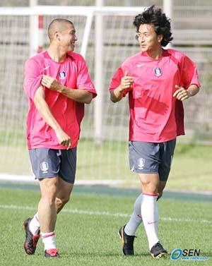 올 설 연휴에는 '반지의 제왕' 안정환(30.뒤스부르크)과 '아우토반' 차두리(26.프랑크푸르트) 등 두 분데스리거들이 독일월드컵이 열리는 현지에서 나란히 그라운드를 누빌 전망이다. 독일 축구전문지 는 27일(이하 한국시간) 인터넷 홈페이지(www.kicker.de)를 통해 최근 뒤스부르크로 이적한 안정환과 차두리가 각각 슈투트가르트, 바이에르 레버쿠젠과의 후반기 개막전에 선발 출전할 것으로 예상했다. 는 안정환을 직접 언급하며 28일 오후 11시반 킥오프되는 슈투트가르트와의 원정경기에서 위르겐 콜러 신임 감독 및 새로 가세한 미드필더인 타라라체, 칼리주리와 함께 분데스리가 데뷔전을 가질 것으로 점쳤다. 상대 슈투트가르트의 감독은 공교롭게도 지난 2002년 한일월드컵 16강에서 안정환이 결승 골든골을 터뜨릴 때 이탈리아 지휘봉을 잡았던 지오반니 트라파토니 감독이어서 관심을 모은다. 특히 뒤스부르크는 현재 정규리그에서 2승6무9패(승점12)로 18개팀 중 17위에 처져 있는 데다 1부리그 팀 가운데 가장 적은 15골에 그치고 있어 쿠르트와 함께 3-4-1-2 포메이션의 투톱을 이룰 안정환의 발 끝에 기대가 모아진다. 차두리도 바이에르 레버쿠젠과의 원정경기에 나선다. 지난 26일 DFB-포칼(독일 FA컵) 8강에 공격수로 선발 출전해 76분간 경기에 나선 차두리는 이번 경기에는 프란시스코 코파도, 이오아니스 아마나티디스에 최전방을 맡기고 측면 공격수로 나설 것으로 보인다. 한편 잉글랜드에서는 '신형엔진' 박지성(25.맨체스터 유나이티드)과 '스나이퍼' 설기현(27.울버햄튼)이 맞대결을 펼칠 것으로 예상되고 있다. 맨체스터 유나이티드와 울버햄튼이 FA(잉글랜드축구협회)컵 4라운드(32강)에서 대결을 펼치고 무릎 부위 부상 중이던 박지성이 출전에 박차를 가하고 있는 것으로 알려져 설기현과의 한판 승부가 전망된다. ◆해외파 설연휴 경기 일정 ▲28일(토) 안정환= 뒤스부르크-슈투트가르트(오후11시30분.원정) 차두리= 프랑크푸르트-바이엘 레버쿠젠(오후11시30분.원정) ▲30일(월) 박지성 설기현= 맨체스터 유나이티드-울버햄튼(오전1시.울버햄튼 홈) 국영호 기자 iam905@osen.co.kr 지난해 대표팀 훈련서 나란히 달리고 있는 안정환(오른쪽)과 차두리 [Copyright ⓒ 한국 최고의 스포츠 전문 미디어 OSEN(www.osen.co.kr) 무단전재 및 재배포 금지]
