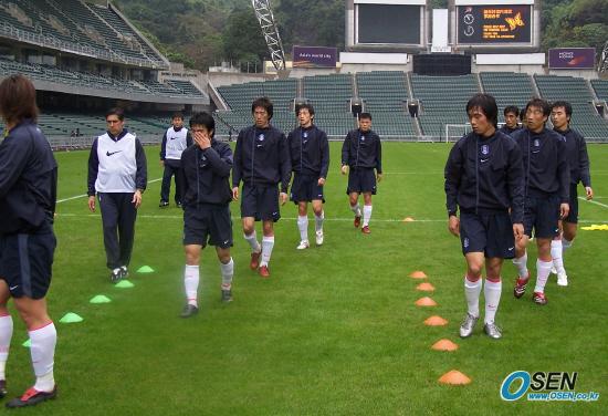 한국대표팀이 크로아티아와의 홍콩 칼스버그컵 경기가 열리기 하루 전인 28일 낮 가랑비가 내리는 가운데 홍콩 스타디움에서 가진 마지막 훈련서 압신 고트비 코치의 지도로 보조 기구를 이용한 체력 훈련을 받고 있다. /홍콩=박상현 기자 tankpark@osen.co.kr [Copyright ⓒ 한국 최고의 스포츠 전문 미디어 OSEN(www.osen.co.kr) 무단전재 및 재배포 금지]