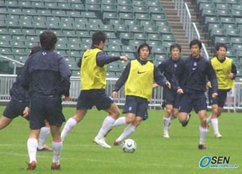 "반드시 크로아티아 깬다". 딕 아드보카트 감독이 이끄는 한국 축구대표팀이 크로아티아와의 홍콩 칼스버그컵 첫 경기가 열리기 하루 전인 28일 격전지인 홍콩 스타디움에서 마지막 훈련을 가졌다. 보슬비도 아랑곳 하지 않고 대표팀 선수들은 한국 선수들의 훈련을 보기 위해 모여든 홍콩 시민과 한국 교민의 열광적인 환호를 받으며 운동장에 입장, 몸 풀기와 실전 훈련, 체력 훈련으로 이어지는 1시간 30분여에 걸친 훈련을 모두 소화했다. 이날 실전 훈련에서는 전날 시우사이완 구장에서 가졌던 훈련에서 뛰었던 선수 중 김진규 대신 김상식이 투입돼 눈길을 끌었다. 노란 조끼를 입고 뛴 선발 예정멤버에는 스리톱에 정경호 이동국 이천수가 섰고 중원에는 백지훈 김두현 이호가 포진했다. 또 포백 수비라인에는 김동진과 조원희가 좌우 풀백을 맡은 가운데 최진철과 김상식이 가운데 수비를 책임졌다. 골문은 여전히 이운재가 지켰다. 또 조끼를 입지 않은 멤버 중에는 전날 훈련에 이어 최태욱이 오른쪽 수비수로 출전해 눈길을 끌었다. 한편 대표팀 미디어 담당관인 이원재 부장은 대표팀 선수들이 상의 레드, 하의 데님 블루, 양말 레드로 이어지는 주 유니폼을 입고 크로아티아전에 나선다고 밝혔다. 홍콩=글, 사진 박상현 기자 tankpark@osen.co.kr [Copyright ⓒ 한국 최고의 스포츠 전문 미디어 OSEN(www.osen.co.kr) 무단전재 및 재배포 금지]