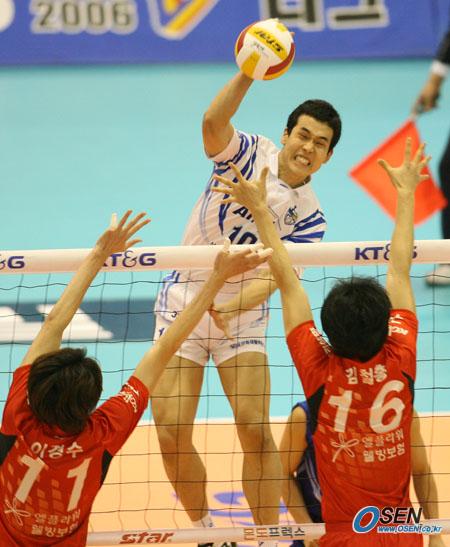 28일 서울 올림픽공원 펜싱경기장에서 열린 KT&G 2005-2006 V-리그 삼성화재와 LG화재의 경기에서 삼성화재의 센터 고희진이 LG화재 이경수와 김철홍이 블로킹 타이밍을 잡기 전에 중앙 속공을 시도하고 있다./올림픽공원=박영태 기자 ds3fan@osen.co.kr [Copyright ⓒ 한국 최고의 스포츠 전문 미디어 OSEN(www.osen.co.kr) 무단전재 및 재배포 금지]