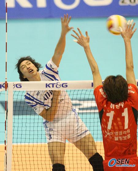 28일 서울 올림픽공원 펜싱경기장에서 열린 KT&G 2005-2006 V-리그 삼성화재와 LG화재의 경기에서 삼성화재의 라이트 김세진이 LG화재의 레프트 이경수의 단독 블로킹을 앞에 놓고 강타를 때리고 있다./올림픽공원=박영태 기자 ds3fan@osen.co.kr [Copyright ⓒ 한국 최고의 스포츠 전문 미디어 OSEN(www.osen.co.kr) 무단전재 및 재배포 금지]