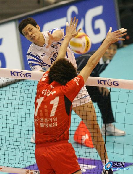 28일 서울 올림픽공원 펜싱경기장에서 열린 KT&G 2005-2006 V-리그 삼성화재와 LG화재의 경기에서 삼성화재의 라이트 장병철의 오픈 강타가 LG화재 이경수의 블로킹에 막히고 있다./올림픽공원=박영태 기자 ds3fan@osen.co.kr [Copyright ⓒ 한국 최고의 스포츠 전문 미디어 OSEN(www.osen.co.kr) 무단전재 및 재배포 금지]