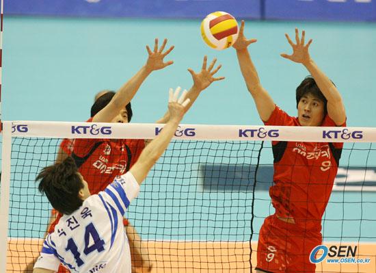 28일 서울 올림픽공원 펜싱경기장에서 열린 KT&G 2005-2006 V-리그 삼성화재와 LG화재의 경기에서 삼성화재의 방신봉(오른쪽)과 LG화재의 석진욱(왼쪽)이 네트 위의 공을 처리하기 위해 서로 손을 뻗고 있다./올림픽공원=박영태 기자 ds3fan@osen.co.kr [Copyright ⓒ 한국 최고의 스포츠 전문 미디어 OSEN(www.osen.co.kr) 무단전재 및 재배포 금지]