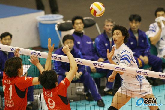 28일 서울 올림픽공원 펜싱경기장에서 열린 KT&G 2005-2006 V-리그 삼성화재와 LG화재의 경기에서 삼성화재의 김세진이 LG화재 이경수와 방신봉의 블로킹 앞에서 연타 공격을 시도하고 있다./올림픽공원=박영태 기자 ds3fan@osen.co.kr [Copyright ⓒ 한국 최고의 스포츠 전문 미디어 OSEN(www.osen.co.kr) 무단전재 및 재배포 금지]
