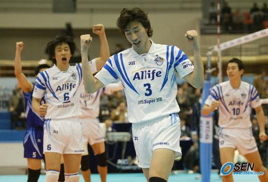 28일 서울 올림픽공원 펜싱경기장에서 열린 KT&G 2005-2006 V-리그 삼성화재와 LG화재의 경기에서 삼성화재 김세진이 오른쪽 공격을 성공시킨 뒤 주먹을 불끈쥐며 환호하고 있다./올림픽공원=박영태 기자 ds3fan@osen.co.kr [Copyright ⓒ 한국 최고의 스포츠 전문 미디어 OSEN(www.osen.co.kr) 무단전재 및 재배포 금지]