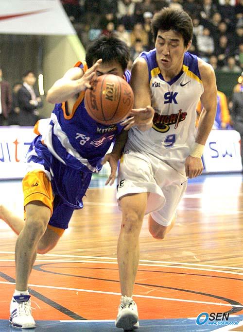 설 연휴인 28일 서울 잠실학생체육관에서 벌어진 2005~2006 KCC 프로농구 서울 SK와 안양 KT&G의 경기서 1쿼터 20여 점 차로 뒤지던 SK가 데이먼 브라운과 방성윤의 활약으로 104-100의 짜릿한 역전승을 거두었다. 3쿼터서 SK의 임재현과 KT&G의 주희정이 공을 잡기 위해 서로 다투고 있다./잠실학생체=손용호 기자spjj@osen.co.kr [Copyright ⓒ 한국 최고의 스포츠 전문 미디어 OSEN(www.osen.co.kr) 무단전재 및 재배포 금지]