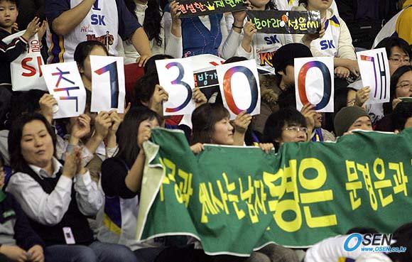 설 연휴인 28일 서울 잠실학생체육관에서 벌어진 2005~2006 KCC 프로농구 서울 SK와 안양 KT&G의 경기서 1쿼터 20여 점 차로 뒤지던 SK가 데이먼 브라운과 방성윤의 활약으로 104-100의 짜릿한 역전승을 거두었다. 2쿼터서 SK의 문경은이 3점슛을 하나 보태 통산 1300개의 3점슛을 기록하자 팬들이 축하의 플래카드를 들어보이고 있다./잠실학생체=손용호 기자 spjj@osen.co.kr [Copyright ⓒ 한국 최고의 스포츠 전문 미디어 OSEN(www.osen.co.kr) 무단전재 및 재배포 금지]