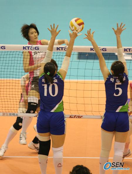28일 서울 올림픽공원 펜싱경기장에서 열린 KT&G 2005-2006 V-리그 여자부 경기서 흥국생명의 황연주가 KT&G 임효숙과 박경낭의 블로킹을 앞에 두고 중앙 공격을 시도하고 있다. /올림픽공원=박영태 기자/ds3fan@osen.co.kr [Copyright ⓒ 한국 최고의 스포츠 전문 미디어 OSEN(www.osen.co.kr) 무단전재 및 재배포 금지]