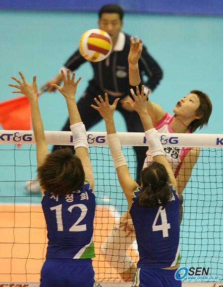 28일 서울 올림픽공원 펜싱경기장에서 열린 KT&G 2005-2006 V-리그 여자부 경기서 흥국생명의 '슈퍼 루키' 김연경이 KT&G 지정희와 이효희의 블로킹이 붙자 연타로 공격하고 있다. /올림픽공원=박영태 기자 ds3fan@osen.co.kr [Copyright ⓒ 한국 최고의 스포츠 전문 미디어 OSEN(www.osen.co.kr) 무단전재 및 재배포 금지]
