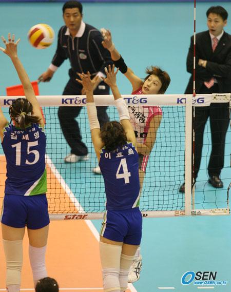 28일 서울 올림픽공원 펜싱경기장에서 열린 KT&G 2005-2006 V-리그 여자부 경기서 흥국생명의 주포 김연경의 대각선 공격을 KT&G의 장신(190cm) 김세영이 블로킹으로 저지하려는 순간 선심과 흥국생명 황현주 감독의 시선이 집중되고 있다. /올림픽공원=박영태 기자 ds3fan@osen.co.kr [Copyright ⓒ 한국 최고의 스포츠 전문 미디어 OSEN(www.osen.co.kr) 무단전재 및 재배포 금지]