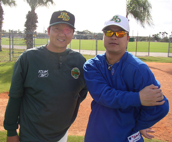 WBC 출전에 대비한 훈련을 위해 지난 27일(이하 한국시간) 미국 플로리다주 브래든튼의 현대 유니콘스 스프링캠프에 합류한 뉴욕 메츠의 구대성(오른쪽)이 한양대 1년 선배인 정민태와 오랫만에 만나 회포를 풀고 있다./현대 유니콘스 제공 [Copyright ⓒ 한국 최고의 스포츠 전문 미디어 OSEN(www.osen.co.kr) 무단전재 및 재배포 금지]