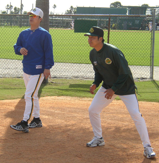 WBC 출전에 대비한 훈련을 위해 지난 27일(이하 한국시간) 미국 플로리다주 브래든튼의 현대 유니콘스 스프링캠프에 합류한 뉴욕 메츠의 구대성(왼쪽)이 한양대 1년 선배인 정민태와 함께 러닝 훈련을 소화하고 있다./현대 유니콘스 제공 [Copyright ⓒ 한국 최고의 스포츠 전문 미디어 OSEN(www.osen.co.kr) 무단전재 및 재배포 금지]