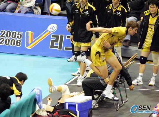 30일 서울 올림픽공원 펜싱경기장에서 벌어진 KT&G 2005-2006 V-리그 남자부 경기서 천안 현대캐피탈 스카이워커스와 대전 삼성화재 블루팡스의 경기에서 현대캐피탈의 루니가 벤치 쪽으로 몸을 날려 볼을 받아내고 있다./올림픽공원=주지영 기자 jj0jj0@osen.co.kr [Copyright ⓒ 한국 최고의 스포츠 전문 미디어 OSEN(www.osen.co.kr) 무단전재 및 재배포 금지]