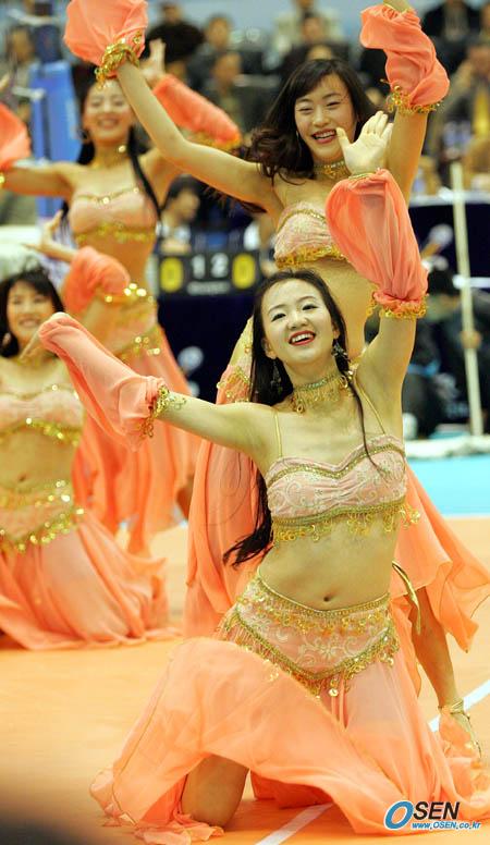 30일 서울 올림픽공원 펜싱경기장에서 열린 KT&G 2005-2006 V-리그가 천안 현대캐피탈 스카이워커스와 대전 삼성화재 블루팡스의 경기서 치어리더들이 화려한 의상과 댄스로 관중들의 시선을 모으고 있다./올림픽공원=주지영 기자 jj0jj0@osen.co.kr [Copyright ⓒ 한국 최고의 스포츠 전문 미디어 OSEN(www.osen.co.kr) 무단전재 및 재배포 금지]