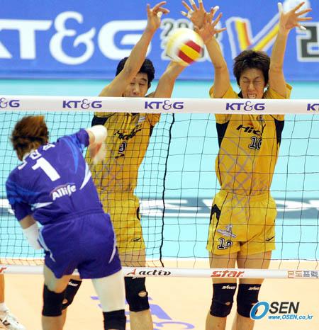 30일 서울 올림픽공원 펜싱경기장에서 벌어진 KT&G 2005-2006 V-리그 천안 현대캐피탈 스카이워커스와 대전 삼성화재 블루팡스의 경기서 현대캐피탈이 0-2를 뒤집고 대역전승을 거뒀다. 현대캐피탈의 후인정(왼쪽)이 윤봉우와 함께 블로킹에 나서 삼성화재 신진식의 강타를 막아내고 있다./올림픽공원=주지영 기자 jj0jj0@osen.co.kr [Copyright ⓒ 한국 최고의 스포츠 전문 미디어 OSEN(www.osen.co.kr) 무단전재 및 재배포 금지]
