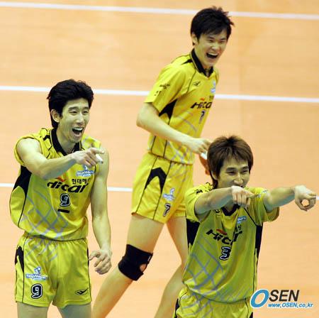 30일 서울 올림픽공원 펜싱경기장에서 벌어진 KT&G 2005-2006 V-리그 천안 현대캐피탈 스카이워커스와 대전 삼성화재 블루팡스의 경기서 현대캐피탈이 0-2를 뒤집고 대역전승을 거뒀다. 후인정(왼쪽)과 권영민(오른쪽)이 공격을 성공시킨 루니를 가리키며 환호하고 있다./올림픽공원=주지영 기자 jj0jj0@osen.co.kr [Copyright ⓒ 한국 최고의 스포츠 전문 미디어 OSEN(www.osen.co.kr) 무단전재 및 재배포 금지]