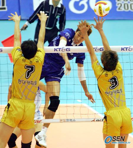 30일 서울 올림픽공원 펜싱경기장에서 벌어진 KT&G 2005-2006 V-리그 남자부 경기서 선두 천안 현대캐피탈 스카이워커스가 0-2의 열세를 뒤집고 대전 삼성화재 블루팡스에 대역전승을 거뒀다. 삼성화재의 신진식이 현대캐피탈 이선규와 권영민의 블로킹을 뚫으며 공격하고 있다./올림픽공원=주지영 기자 jj0jj0@osen.co.kr [Copyright ⓒ 한국 최고의 스포츠 전문 미디어 OSEN(www.osen.co.kr) 무단전재 및 재배포 금지]