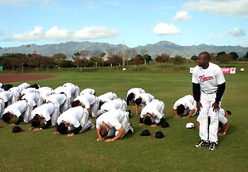 LG 트윈스 미국 하와이 스프링 캠프에 웃음꽃이 만발하고 있다. 지난 29일(이하 한국시간) 캠프 합류할 때부터 한국말로 "안녕하십니까! 텔리입니다. 자 기합소리 한번! 아자!"라고 첫 인사를 건네 범상치 않음을 보여줬던 외국인 투수 텔레마코(31)가 연일 선수단에 웃음을 제공하고 있다. 텔레마코는 지난 30일 저녁 숙소인 하와이 프린스호텔 3층 만찬장에서 설날을 맞아 가진 윷놀이에서 또 한 번 진가(?)를 발휘했다. 투수팀과 야수팀으로 나눠 가진 윷놀이에서 텔레마코는 윷을 멍석이 아닌 상에다 던져 선수단을 폭소 도가니로 몰아넣었다. 윷놀이가 처음인 것을 여실히 드러냈지만 그래도 텔레마코가 포함된 투수팀이 승리. 텔레마코의 '한국문화 체험기'는 이날 오전에도 한 건 있었다. 오전 운동장에서 훈련에 앞서 선수단은 이순철 감독 등 코칭스태프에게 단체로 세배를 했다. 하지만 세배를 모르는 텔레마코는 선수단과 완전히 동떨어진 절을 하는 바람에 선수들을 한바탕 웃게 만들었다. 텔레마코는 선수들이 모두 엎드려 있을 때에는 혼자 서 있다가 선수들이 일어나면 혼자 엎드리는 등 어쩔줄 모르며 촌극을 벌였다. 텔레마코의 엉터리 절에도 불구하고 이순철 감독은 주장 서용빈에게 두둑한 세뱃돈을 건넸다. 텔레마코로선 캠프합류 3일만에 한국문화를 톡톡히 체험하며 올 시즌 한국생활의 한 단면을 맛본 것이다. 텔레마코는 적극적으로 한국말과 한국문화에 적응하려는 모습을 보이고 있어 LG 코칭스태프는 그라운드에서도 한국야구에 빠르게 적응할 것으로 기대하고 있다. 선수단의 단체세배때 혼자 동떨어진 행동으로 어쩔줄 몰라하는 텔레마코. /사진제공=LG 트윈스 박선양 기자 sun@osen.co.kr [Copyright ⓒ 한국 최고의 스포츠 전문 미디어 OSEN(www.osen.co.kr) 무단전재 및 재배포 금지]