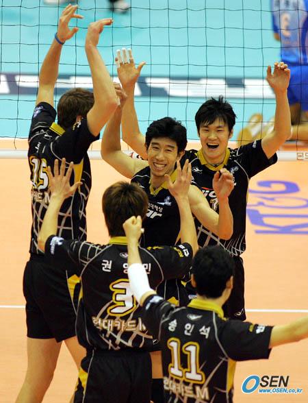 31일 서울 올림픽공원 펜싱경기장에서 벌어진 KT&G 2005-2006 V-리그 남자부 경기 천안 현대캐피탈 스카이워커스와 인천 대한항공 점보스의 경기서 현대캐피탈 선수들이 포인트를 올린 뒤 기뻐하고 있다. /올림픽공원=주지영 기자 jj0jj0@osen.co.kr [Copyright ⓒ 한국 최고의 스포츠 전문 미디어 OSEN(www.osen.co.kr) 무단전재 및 재배포 금지]