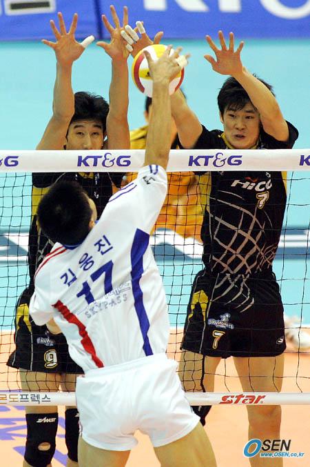 31일 서울 올림픽공원 펜싱경기장에서 벌어진 KT&G 2005-2006 V-리그 남자부 경기 천안 현대캐피탈 스카이워커스와 인천 대한항공 점보스의 경기서 대한항공의 김웅진의 중앙 공격을 현대캐피탈 이선규(오른쪽)와 후인정이 블로킹으로 차단하고 있다. /올림픽공원=주지영 기자 jj0jj0@osen.co.kr [Copyright ⓒ 한국 최고의 스포츠 전문 미디어 OSEN(www.osen.co.kr) 무단전재 및 재배포 금지]