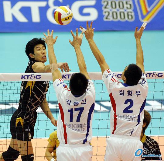 31일 서울 올림픽공원 펜싱경기장에서 벌어진 KT&G 2005-2006 V-리그 남자부 천안 현대캐피탈 스카이워커스와 인천 대한항공 점보스의 경기서 현대캐피탈의 후인정이 대한항공 김웅진과 김형우의 블로킹 위로 볼을 살짝 넘기고 있다./올림픽공원=주지영 기자 jj0jj0@osen.co.kr [Copyright ⓒ 한국 최고의 스포츠 전문 미디어 OSEN(www.osen.co.kr) 무단전재 및 재배포 금지]