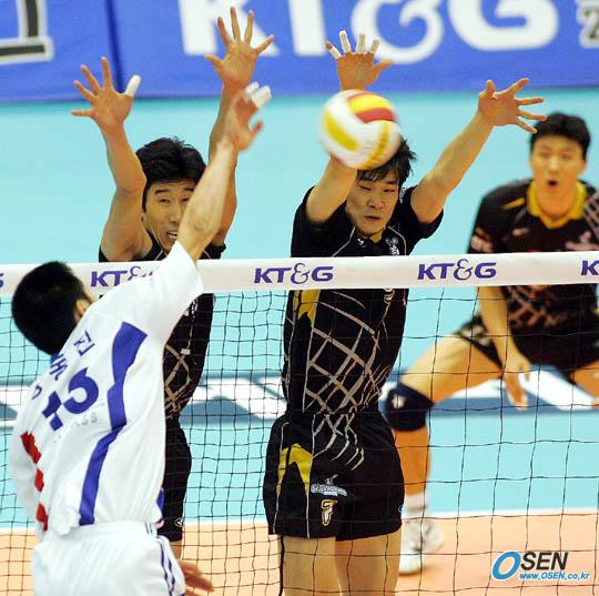 31일 서울 올림픽공원 펜싱경기장에서 벌어진 KT&G 2005-2006 V-리그 남자부 천안 현대캐피탈 스카이워커스와 인천 대한항공 점보스의 경기서 대한한공의 강동진이 현대캐피탈 후인정(왼쪽)과 이선규의 블로킹을 피해 볼을 틀어치고 있다./올림픽공원=주지영 기자 jj0jj0@osen.co.kr [Copyright ⓒ 한국 최고의 스포츠 전문 미디어 OSEN(www.osen.co.kr) 무단전재 및 재배포 금지]