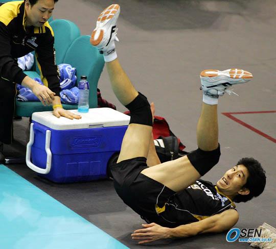 31일 서울 올림픽공원 펜싱경기장에서 벌어진 KT&G 2005-2006 V-리그 남자부 천안 현대캐피탈 스카이워커스와 인천 대한항공 점보스의 경기서 현대캐피탈의 후인정이 공을 잡기 위해 벤치 쪽으로 몸을 날려 넘어지고 있다./올림픽공원=주지영 기자 jj0jj0@osen.co.kr [Copyright ⓒ 한국 최고의 스포츠 전문 미디어 OSEN(www.osen.co.kr) 무단전재 및 재배포 금지]