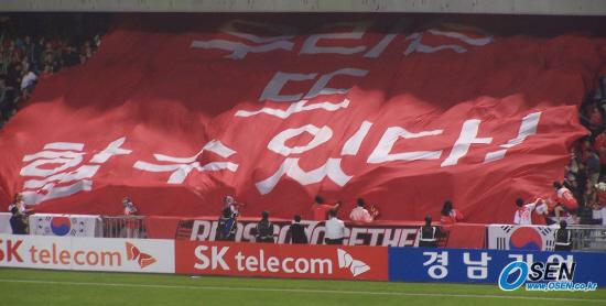 한국 축구대표팀 공식 서포터스 '붉은 악마'가 1일 홍콩 스타디움에서 열린 한국과 덴마크의 칼스버그컵 결승전에 앞서 '우리는 또 할 수 있다'라고 적힌 대형천을 들고 응원을 하고 있다. /홍콩=박상현 기자 tankpark@osen.co.kr [Copyright ⓒ 한국 최고의 스포츠 전문 미디어 OSEN(www.osen.co.kr) 무단전재 및 재배포 금지]