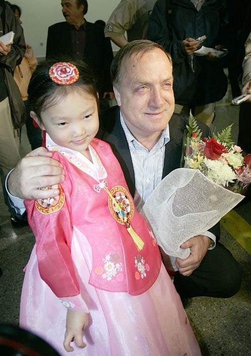 딕 아드보카트 한국 축구 대표팀 감독이 3일(한국시간) 새벽 LA 국제공항에 도착해 환영 나온 교민 어린이로부터 꽃다발을 받고 활짝 웃고 있다. 대표팀을 맞이한 어린이들은 LA 유소년 축구 클럽 '레드스타'의 꼬마 선수들이다./LA=news & image 제공 [Copyright ⓒ 한국 최고의 스포츠 전문 미디어 OSEN(www.osen.co.kr) 무단전재 및 재배포 금지]
