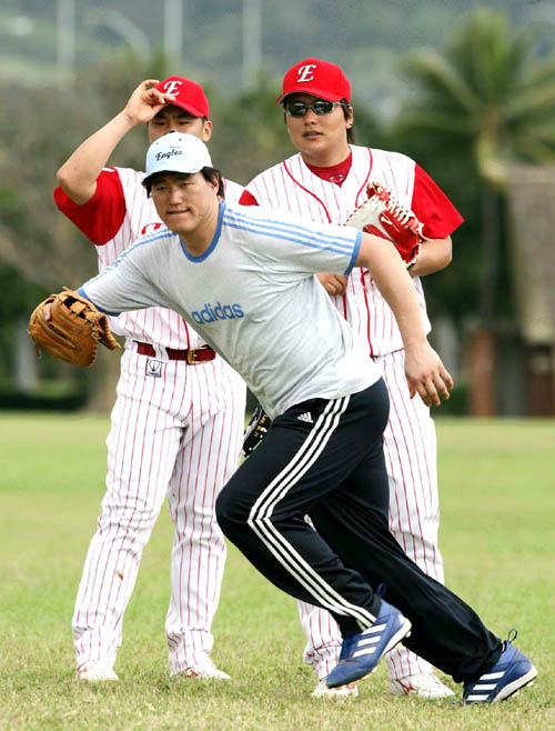 지난 2일 출국해 한화 이글스의 미국 하와이 전지훈련 캠프에 합류한 '빅초이' 최희섭(LA 다저스)이 첫 날부터 훈련에 힘을 쏟고 있다. 한화 1루수로서 중심타자이자 WBC 주전 경쟁을 벌여야 할 후배 김태균이 지켜보는 가운데 최희섭이 수비훈련을 하고 있다. /한화 이글스 제공 [Copyright ⓒ 한국 최고의 스포츠 전문 미디어 OSEN(www.osen.co.kr) 무단전재 및 재배포 금지]