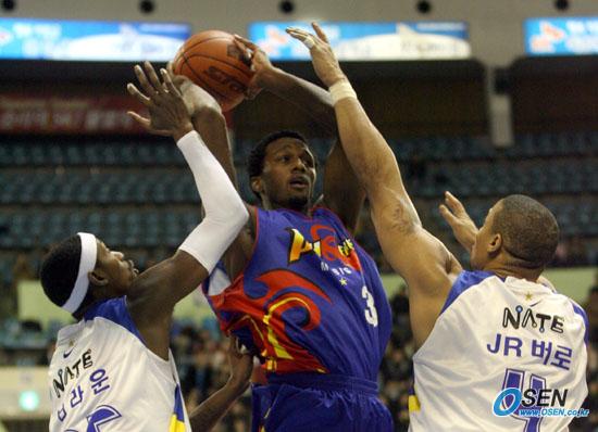 7일 잠실학생체육관에서 열린 2005-2006 KCC 프로농구 서울 SK와 울산 모비스의 경기에서 모비스의 '트리플 더블러' 크리스 월리엄스가 SK의 브라운(왼쪽)과 주니어 버로 사이에서 골밑슛을 시도하고 있다./잠실학생체=박영태 기자 ds3fan@osen.co.kr [Copyright ⓒ 한국 최고의 스포츠 전문 미디어 OSEN(www.osen.co.kr) 무단전재 및 재배포 금지]