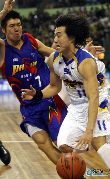 7일 서울 잠실학생체육관에서 열린 2005~2006 KCC 프로농구 서울 SK와 울산 모비스의 경기에서 SK가 막판까지 박빙의 접전을 벌인 끝에 94-93으로 극적인 승리를 거뒀다. SK의 방성윤이 갈기 머리를 휘날리며 모비스 이병석의 마크 옆으로 골밑 돌파를 시도하고 있다./잠실학생체=박영태 기자 ds3fan@osen.co.kr [Copyright ⓒ 한국 최고의 스포츠 전문 미디어 OSEN(www.osen.co.kr) 무단전재 및 재배포 금지]