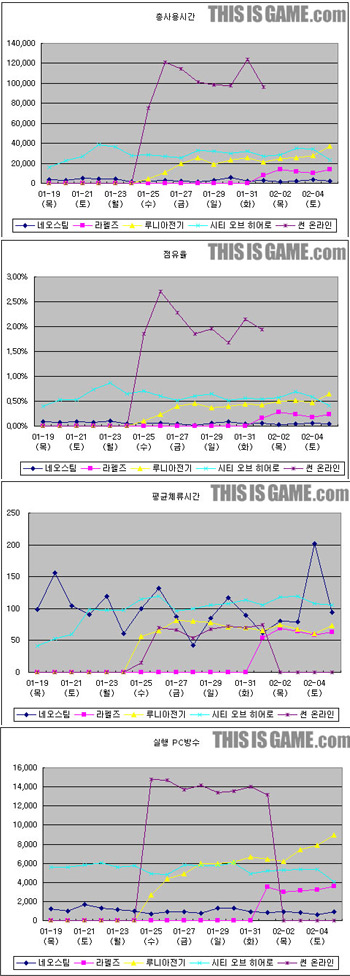 5개 오픈베타게임 PC방 성적표는? [디스이즈게임 - 김광택 기자] 웹젠의 차기작 이 비슷한 시기에 오픈베타테스트를 시작한 다른 4개 게임을 압도하면서 ‘돌풍의 핵’으로 급부상했다. PC방 전문 리서치업체인 게임트릭스가 1월 19일부터 2월 5일까지 등 5개 게임의 PC방 트렌드를 분석한 결과 프리오픈베타테스트를 진행했던 웹젠의 이 ‘평균체류시간’을 제외한 ‘총사용시간’, ‘점유율’, 실행 PC 대수’ 등에서 다른 게임을 크게 앞선 것으로 분석됐다. 특히 은 정식오픈베타테스트가 시작되지도 않은 시점임에도 불구하고 전체게임순위 11위까지 올라가는 기현상을 보이며 MMORPG 분야에서 와 에 이어 5위를 기록했다. 게임트릭스 관계자는 “은 스타일의 게임방식으로 초반진입장벽을 크게 낮춰 많은 게이머들에게 어필했다”며 “넥슨의 , 한빛소프트의 가 나오면 상황이 달라지겠지만 현재까지는 의 수치가 놀라울 정도”라고 말했다. 보다 일주일 가량 먼저 오픈베타테스트를 시작한 는 ‘진입장벽이 높은 게임’이라는 주위의 우려를 말끔히 씻어내며 예상밖의 선전을 기록해, 보다 좋은 성적을 거뒀다. 반면 한빛소프트가 산하 스튜디오를 통해 자체개발한 은 시장진입 초기부터 별다른 관심을 받지 못하며 다소 뒤쳐지는 모습을 보여 아쉬움을 줬다. [이 기사는 PC방 전문 리서치업체인 게임트릭스의 협조를 받아 작성한 것입니다. PC방 통계이기 때문에 전체유저의 이용성향과는 다소 차이가 있을 수 있습니다.] 총사용시간 역대 최고수준 게임트릭스에서 수치를 집계한 1월 25일부터 2월 1일까지의 PC방 총사용시간을 살펴보면 ‘ 신드롬’을 어느 정도 짐작해볼 수 있다. 의 사용시간이 잡히기 전에는 가 하루 최고 3만 8,895시간을 기록하며 순항을 계속했던 상황. 하지만 이 프리오픈베타서비스를 시작하면서 지각변동이 시작됐고 게임트릭스에서 집계를 한 첫날인 1월 25일 7만 4,858시간을 기록하며 단숨에 사용시간을 끌어올렸다. 또 다음날에는 무려 12만 시간까지 치솟으며 집계가 끝난 2월 1일까지 평균 10만 시간 정도를 꾸준히 유지했다. 이 프리오픈을 시작하면서 하루 8,000시간까지 올라갔던 한빛소프트의 은 1,000 시간대까지 주저앉으며 직접적인 타격을 받은 것으로 점쳐진다. 하지만 넥슨의 와 엔씨소프트의 는 에 별다른 영향을 받지 않았다. 특히 같은 경우 1월 25일 4,244시간에서 2월 1일에는 2만 시간대까지 올라갔다. 게임트릭스 관계자는 “과 는 각각 게임스타일이 너무 달라 이용자층에서도 교집합이 많지 않았던 것으로 분석된다”고 설명했다. 전체점유율에서도 2% 넘기며 압도적 1위 은 PC방 점유율에서도 압도적인 우위를 보였다. 은 같은 기간 오픈베타테스트를 시작한 게임과 비교해 적게는 3배, 많게는 20배 이상 높은 점유율을 기록했다. 특히 1월 26일에는 2.71%의 점유율을 기록하며 지난해 말 돌풍을 일으켰던 써니YNK의 을 프리오픈일 시작한지 3일만에 0.4% 차이로 추격했다. 는 총사용시간에 이어 점유율 면에서도 에 이어 2위를 기록하며 0.5~0.8% 대의 박스권을 형성했다. 에 밀려 계속 3등을 유지하던 는 2월 5일 처음으로 점유율에서 를 앞질렀으며 이후 두 게임은 앞서거니 뒷서거니 하는 모습을 보이고 있는 상황이다. 평균체류시간은 가 최고 이 수많은 유저들의 이목을 집중시키며 ‘총사용시간’과 ‘점유율’ 면에서 독보적인 모습을 보였지만 유저가 게임을 얼마나 오랫동안 즐겼는지를 보여주는 ‘평균체류시간’에서는 와 에 밀렸다. 의 평균체류시간은 61분. 프리오픈베타 기간동안 발생했던 잦은 서버다운 현상도 한 원인이 되긴 했지만 방을 만들고 들어가서 한판을 즐기고 또 방을 만드는 식의 게임스타일 때문에 유저들이 오래 머무르지 않았다는 것이 관계자의 설명이다. 11월부터 오픈베타서비스를 진행한 은 평균 100시간의 체류시간을 기록하며 일부 마니아유저 중심으로 안정적인 소비시간을 보여줬다. 98분을 기록한 의 수치는 다소 의외다. 엔씨소프트 이선주 팀장은 “초반진입장벽이 있지만 이 고비를 넘기면 파티플레이가 이뤄지면서 커뮤니티가 본격적으로 시작된다”며 “파티플레이의 묘미를 느끼는 순간 유저들의 접속시간이 비약적으로 늘어나는 형태를 보여준다”고 말했다. 한편 와 의 체류시간은 각각 62분, 70분으로 집계됐다. 실행PC방수, ▲ ▼ 각 게임이 실행된 PC 대수 면에서는 점유율과 총사용시간이 높았던 이 가장 높은 수치를 보였다. 은 하루평균 1만 3,943대의 PC에서 실행됐으며 (6,125대), (5,426대), (3,313대), (1,008대) 순으로 나타났다. 재미있는 것은 1월 18일 오픈베타테스트를 시작한 의 실행PC 대수가 박스권을 유지하고 있는 반면 는 2월 5일 실행PC가 8,955대까지 늘어나며 꾸준한 상승세를 기록하고 있다는 점이다. 넥슨 관계자는 “최근 동시접속자수 2만명을 돌파하는 등 를 찾는 유저들이 꾸준히 늘고 있다”며 “PC에서도 비슷한 형태로 유저가 늘고 있는 것으로 안다”고 말했다. 김광택 기자 www.thisisgame.com [Copyright ⓒ 한국 최고의 스포츠 전문 미디어 OSEN(www.osen.co.kr) 무단전재 및 재배포 금지]