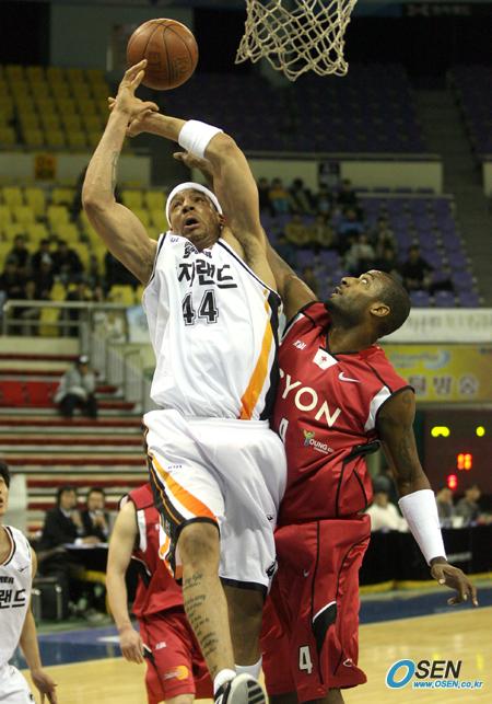 9일 부천체육관에서 열린 2005-2006 KCC 프로농구 인천 전자랜드와 창원 LG의 경기에서 LG의 드미트리우스 알렉산더가 전자랜드 안드레 브라운의 골밑슛을 블로킹하고 있다. 점프해 있는 브라운의 오른쪽 정강이에 문신이 많이 새겨져 있다./부천=박영태 기자 ds3fan@osen.co.kr [Copyright ⓒ 한국 최고의 스포츠 전문 미디어 OSEN(www.osen.co.kr) 무단전재 및 재배포 금지]