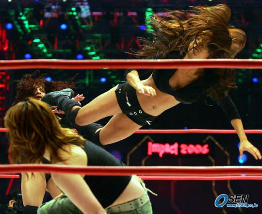 경기도 광명 경륜돔에서 10일 열린 IMPACT 2006 월드 레슬링 챔피언쉽 여자 태그팀 매치에서 한국계 여성 레슬러 게일 김이 마유미 오자키를 쓰러뜨리자 마자 미즈 제넷에게 몸을 날려 공격하고 있다. /광명 경륜돔=주지영 기자 jj0jj0@osen.co.kr [Copyright ⓒ 한국 최고의 스포츠 전문 미디어 OSEN(www.osen.co.kr) 무단전재 및 재배포 금지]