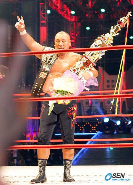 경기도 광명 경륜돔에서 10일 열린 IMPACT 2006 월드 레슬링 챔피언십 헤비급 타이틀 매치에서 한국의 역발산이 미국의 랜스 호이트에 승리를 거둔 뒤 챔피언 벨트와 트로피를 들어보이며 관중들의 환호에 화답하고 있다. /광명 경륜돔=주지영 기자 jj0jj0@osen.co.kr [Copyright ⓒ 한국 최고의 스포츠 전문 미디어 OSEN(www.osen.co.kr) 무단전재 및 재배포 금지]