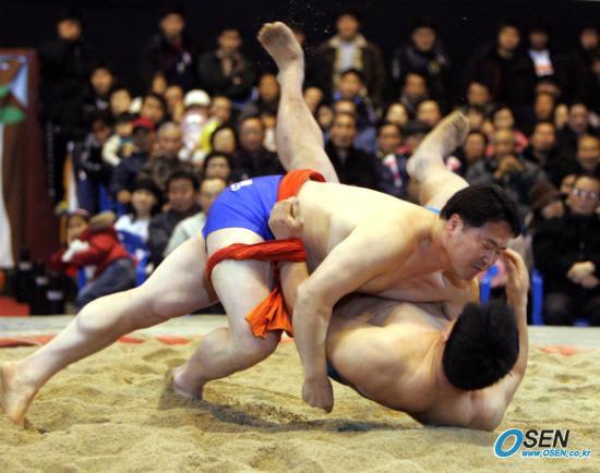 12일 구리 토평고에서 벌어진 올드 스타 씨름대회 예선 4번째 경기서 임용제(왼쪽, 개인사업)가 남동하(춘천기계공고 감독)를 들배지기로 넘기고 있다. 임용제가 남동하를 2-1로 이기고 준결승에 진출했다./구리=손용호 기자 spjj@osen.co.kr [Copyright ⓒ 한국 최고의 스포츠 전문 미디어 OSEN(www.osen.co.kr) 무단전재 및 재배포 금지]