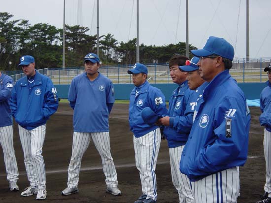 선동렬 감독이 13일 치러질 부친 장례식을 위해 급거 귀국한 삼성 라이온즈의 일본 오키나와 캠프서 한대화 수석코치(오른쪽)가 연습에 앞서 선수들에게 감독의 부재 하에서도 평소와 같은 분위기로 열심히 훈련할 것을 당부하고 있다. 용병들을 포함 모든 선수단이 왼팔에 '근조'라는 리본을 달고 있다./삼성 라이온즈 제공 [Copyright ⓒ 한국 최고의 스포츠 전문 미디어 OSEN(www.osen.co.kr) 무단전재 및 재배포 금지]