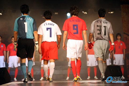 13일 오후 서울 삼성동 코엑스 아셈타워 그랜드 볼룸에서 열린 2006 국가대표 축구팀 유니폼 발표회가 열렸다. 뒷 모습을 보여주는 모델들의 유니폼에 이운재 박지성 설기현 김영광의 이니셜이 새겨져 있다./박영태 기자 ds3fan@osen.co.kr [Copyright ⓒ 한국 최고의 스포츠 전문 미디어 OSEN(www.osen.co.kr) 무단전재 및 재배포 금지]